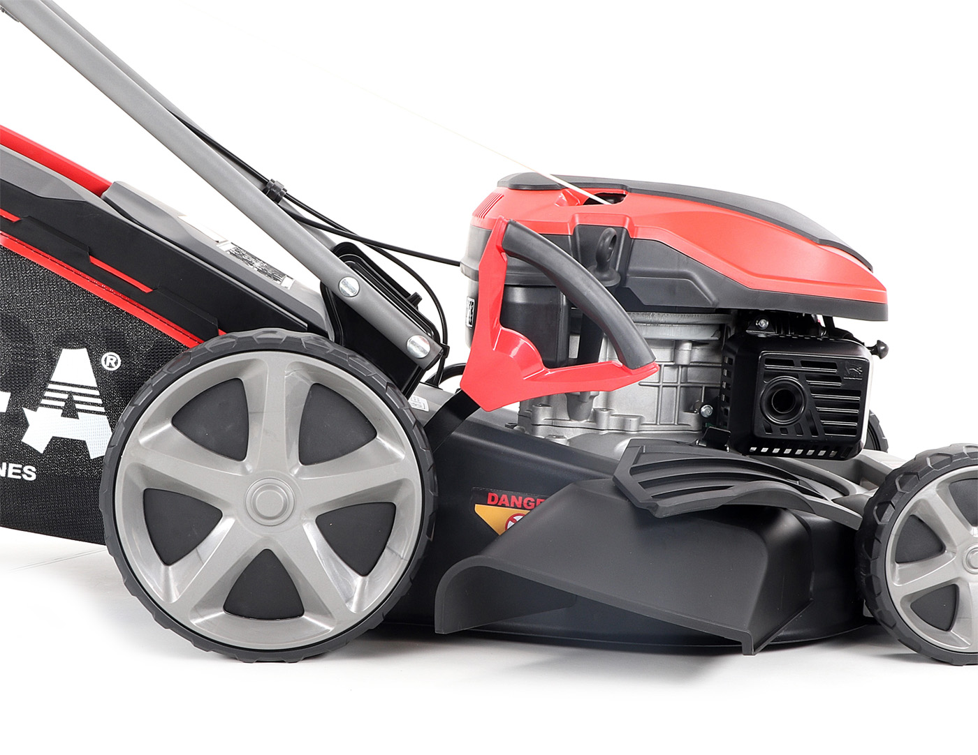 Velká zadní pojezdová kola i přední kola jsou uložena v oboustranných kuličkových ložiscích, centrální nastavení výšky sečení je u značky VeGA také samozřejmostí, jako ergonomické měkčené madlo.