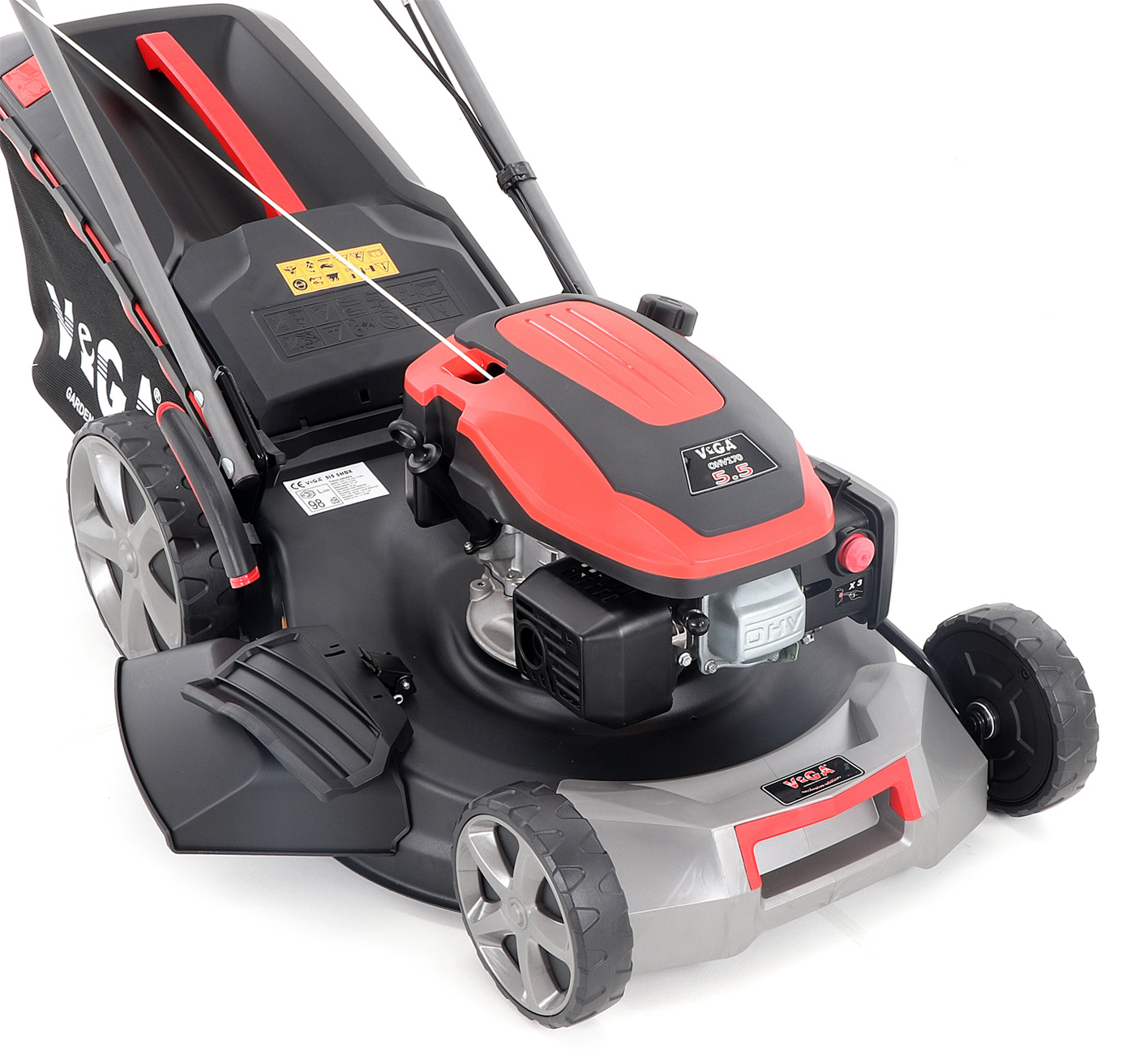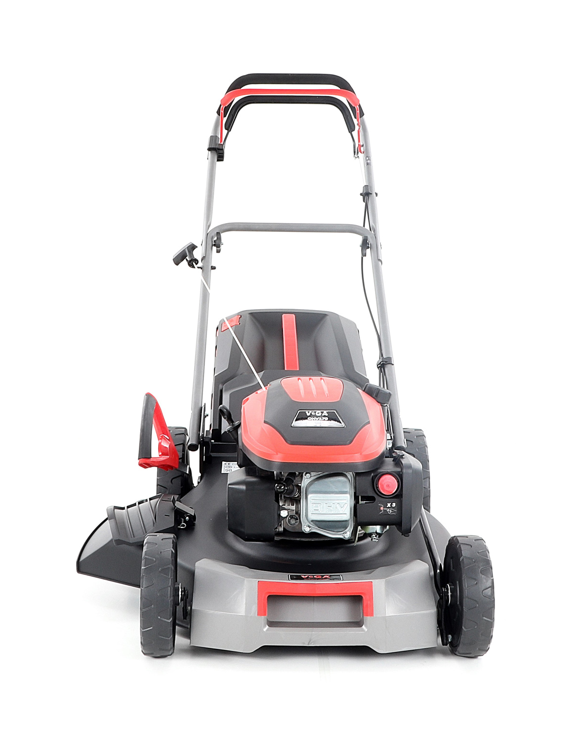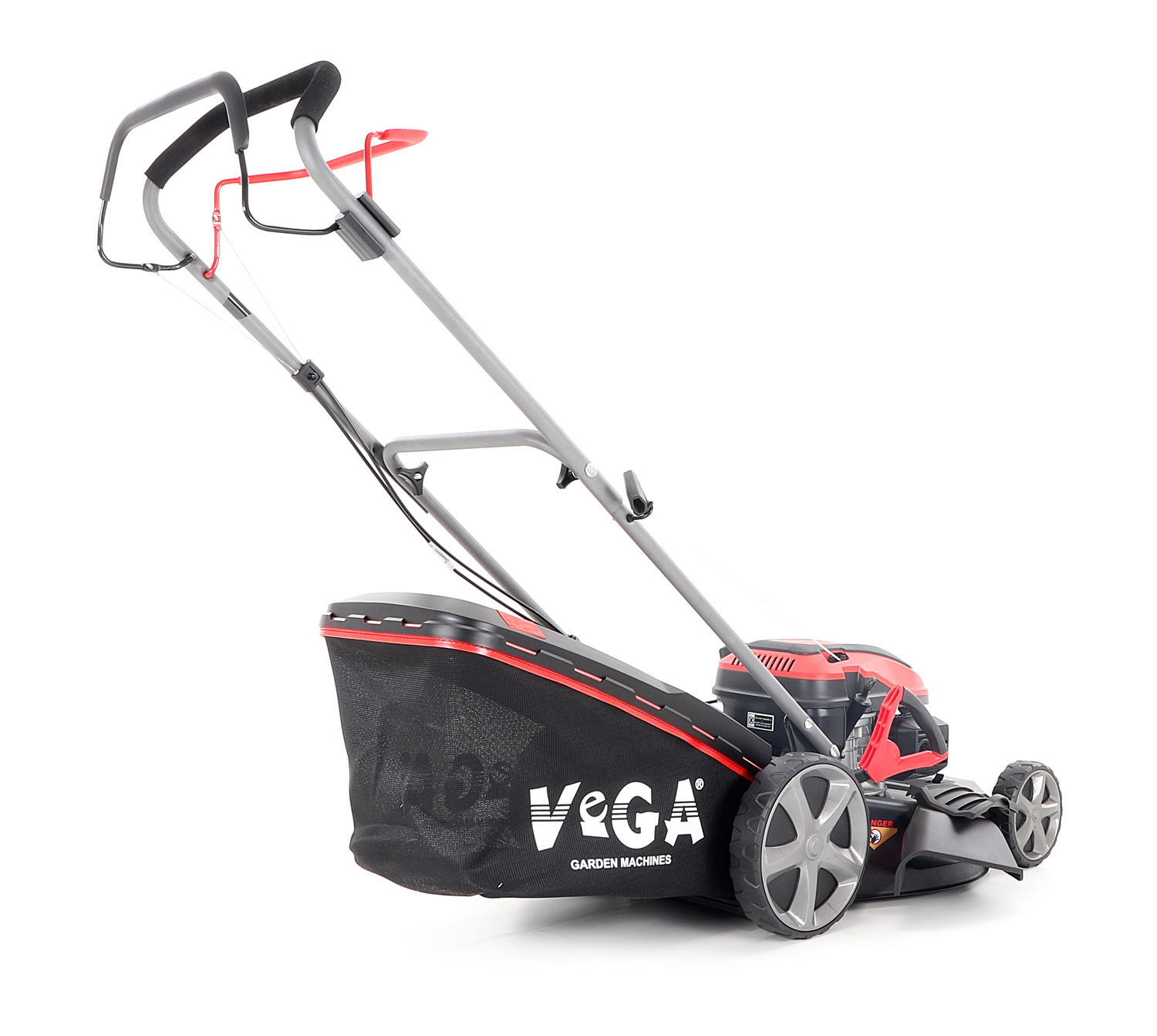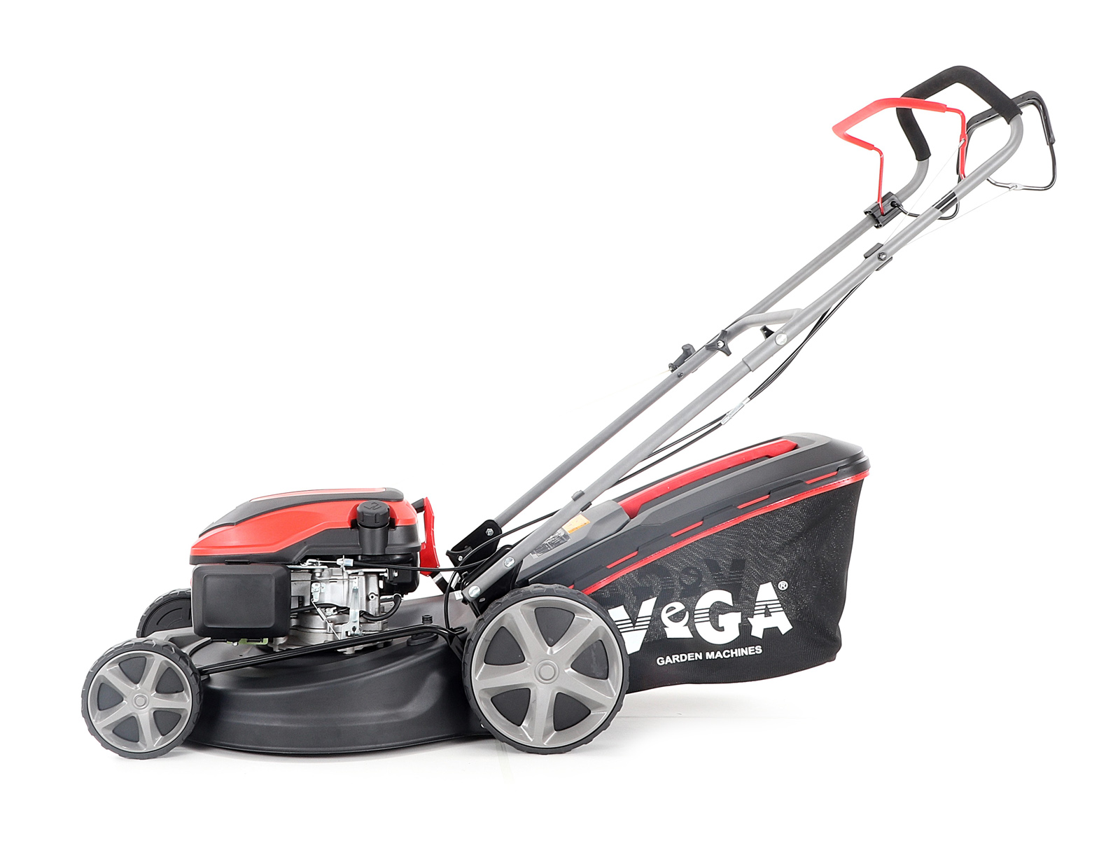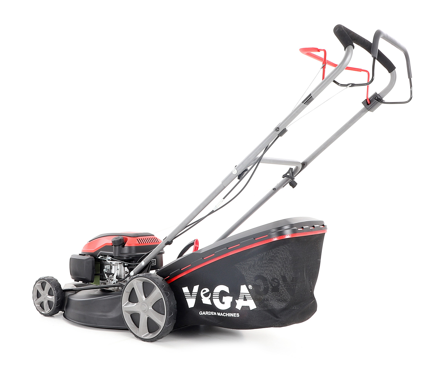 Velká zadní pojezdová kola i přední kola jsou uložena v oboustranných kuličkových ložiscích, centrální nastavení výšky sečení je u značky VeGA také samozřejmostí, jako ergonomické měkčené madlo. Objemný sběrný koš o kapacitě 65 litrů má ukazatel naplnění.