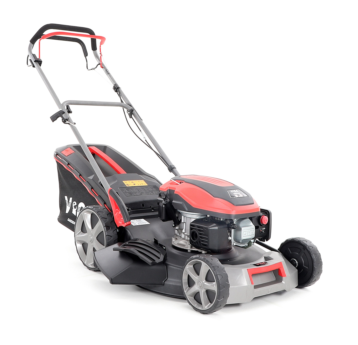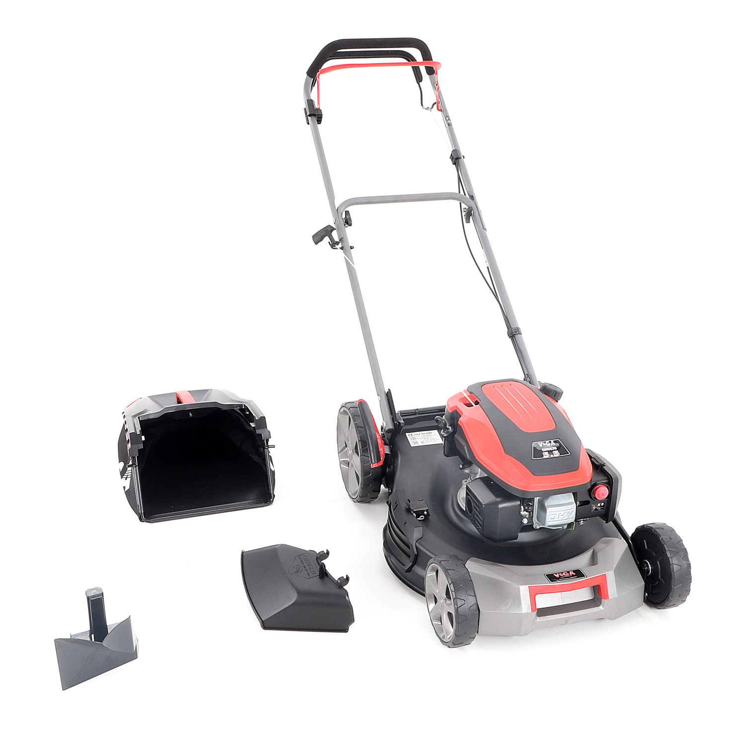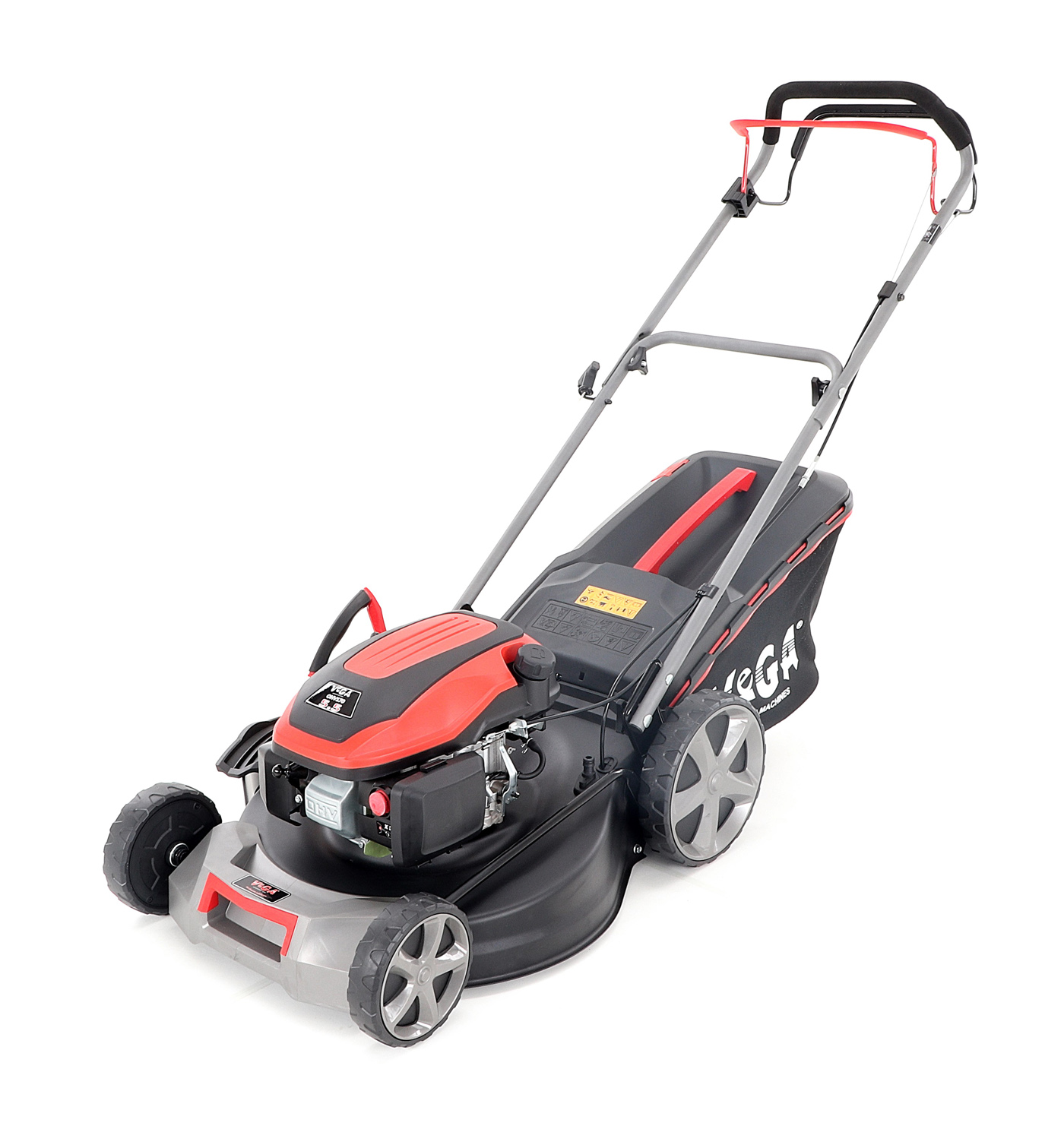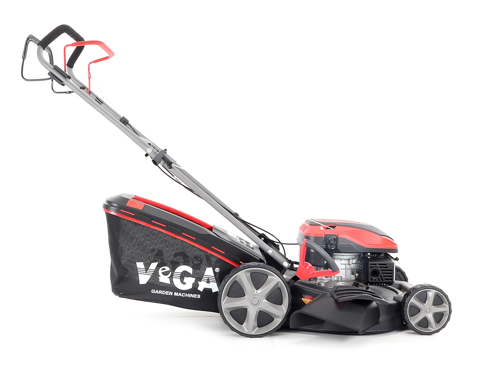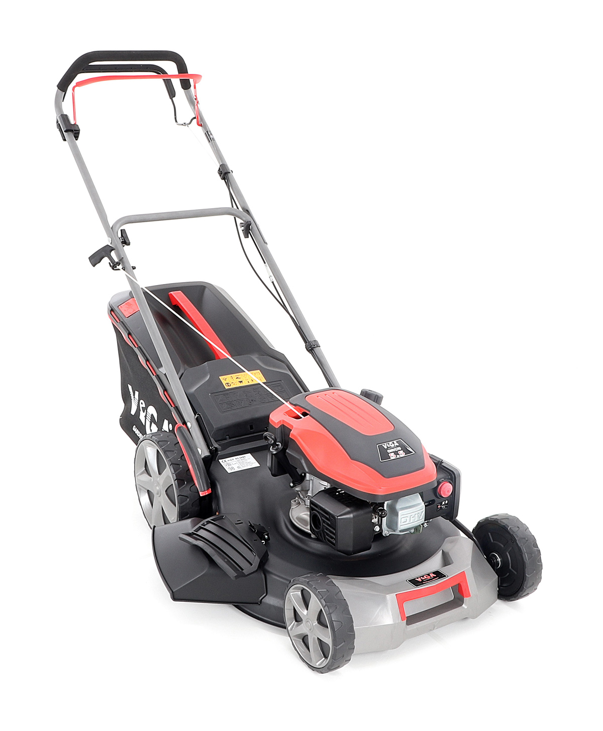 Velká zadní pojezdová kola i přední kola jsou uložena v oboustranných kuličkových ložiscích, centrální nastavení výšky sečení je u značky VeGA také samozřejmostí, jako ergonomické měkčené madlo. Objemný sběrný koš o kapacitě 65 litrů má ukazatel naplnění.